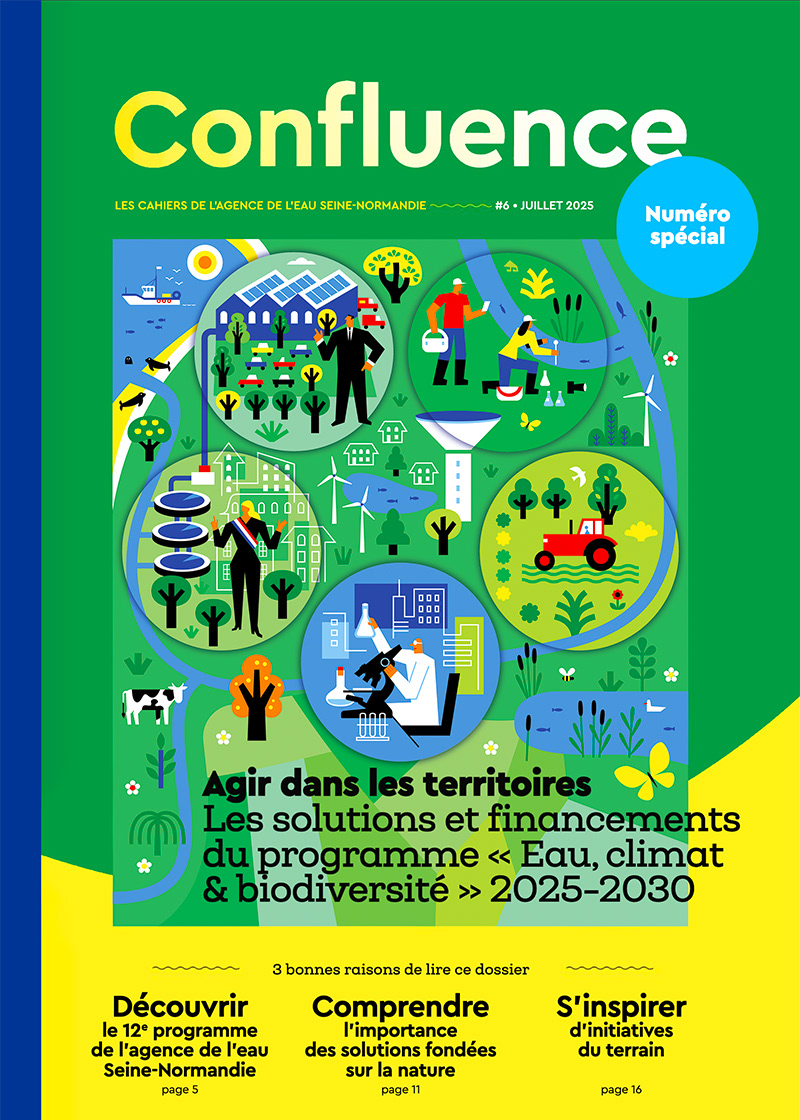 Cover for CONFLUENCE, the publication of the Seine-Normandie water agency. Art direction: Citizen Press Agency.
